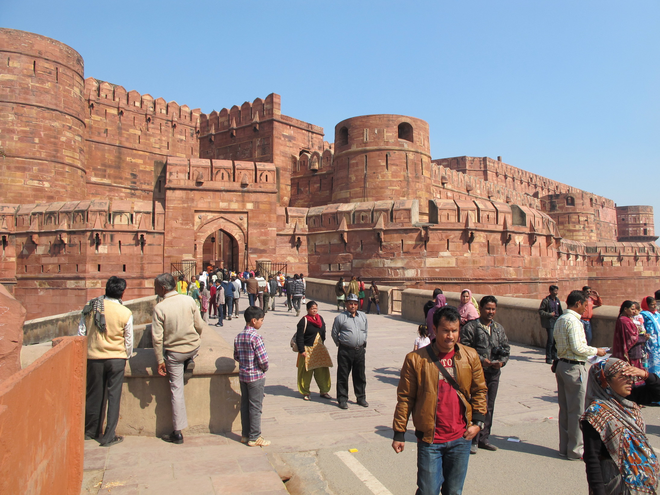 Near the gardens of the Taj Mahal stands the important 16th-century Mughal monument known as the Red Fort of Agra. This powerful fortress of red sandstone encompasses, within its 2.5-km-long enclosure walls, the imperial city of the Mughal rulers. It comprises many fairy-tale palaces, such as the Jahangir Palace and the Khas Mahal, built by Shah Jahan; audience halls, such as the Diwan-i-Khas; and two very beautiful mosques.