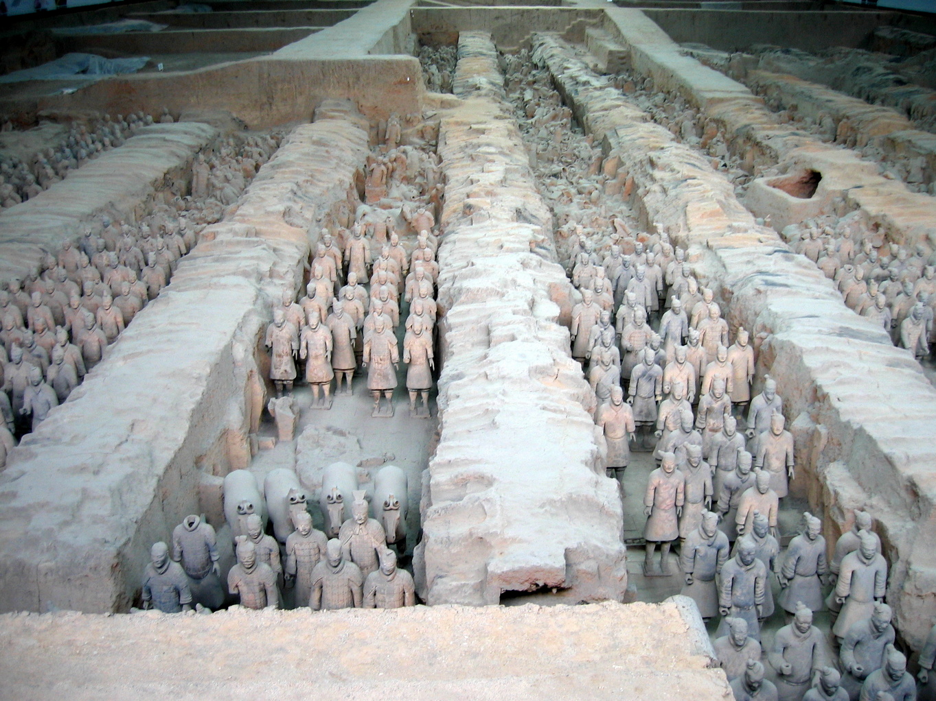 No doubt thousands of statues still remain to be unearthed at this archaeological site, which was not discovered until 1974. Qin (d. 210 B.C.), the first unifier of China, is buried, surrounded by the famous terracotta warriors, at the centre of a complex designed to mirror the urban plan of the capital, Xianyan. The small figures are all different; with their horses, chariots and weapons, they are masterpieces of realism and also of great historical interest.