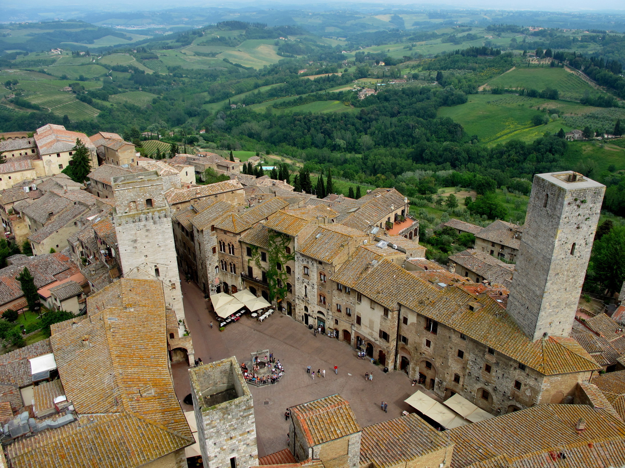 San Gimignano delle belle Torri' is in Tuscany, 56 km south of Florence. It served as an important relay point for pilgrims travelling to or from Rome on the Via Francigena. The patrician families who controlled the town built around 72 tower-houses (some as high as 50 m) as symbols of their wealth and power. Although only 14 have survived, San Gimignano has retained its feudal atmosphere and appearance. The town also has several masterpieces of 14th- and 15th-century Italian art.